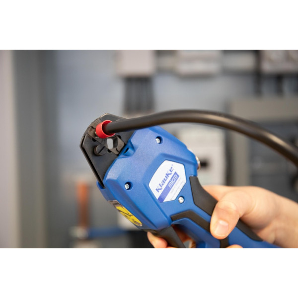 A Klauke EK WF 50 ML professzionális elektromechanikus présfogó gyors és pontos préselést biztosít érvéghüvelyekhez és kettős érvéghüvelyekhez 0,5 – 50 mm² keresztmetszet-tartományban.