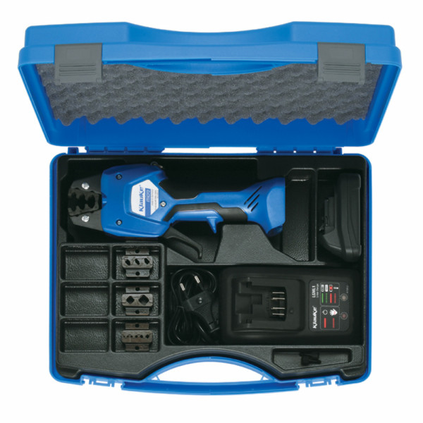 A csomag tartalma: Elektromechanikus univerzális Klauke Micro gép, 10,8 V / 2,5 Ah Li-Ion akkumulátor, töltő, hordtáska, 4 db érvéghüvely présfej (AE5071, AE5072, AE5073, ZAE5072)